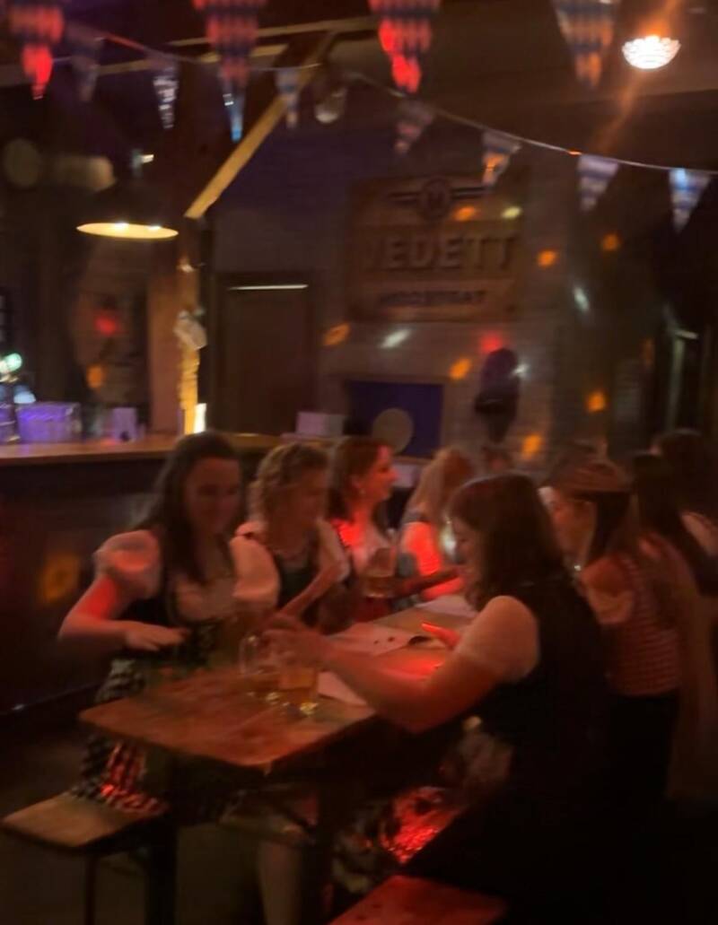 Drie lange rijen tafels met banken vormden het toneel van het feest, of zoals we ze al snel noemden: biertafels, want na vijf minuten waren ze dat letterlijk geworden. Bij binnenkomst kreeg iedereen een bierpul met naam en een liedjesboekje met ‘leuke’ meezingers. De tafels werden verdeeld in drie categorieën: één mannentafel, één vrouwentafel en één oude-gardetafel – verrassend voorspelbaar, maar het werkte uitstekend.